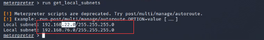 首先,获取网络接口:run get_local_subnets ,由结果我们得知,target1存在两个网络接口,一个76,一个22,76与kali同一网段,是连接外网的,那22就是连接内网(局域网)的。