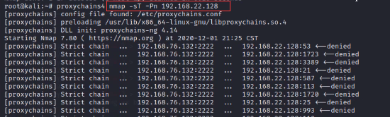 proxychains4 nmap -sT -Pn 192.168.22.0/24 -p80 -Pn:扫描主机检测其是否受到数据包过滤软件或防火墙的保护。 -sT:扫描TCP数据包已建立的连接connect