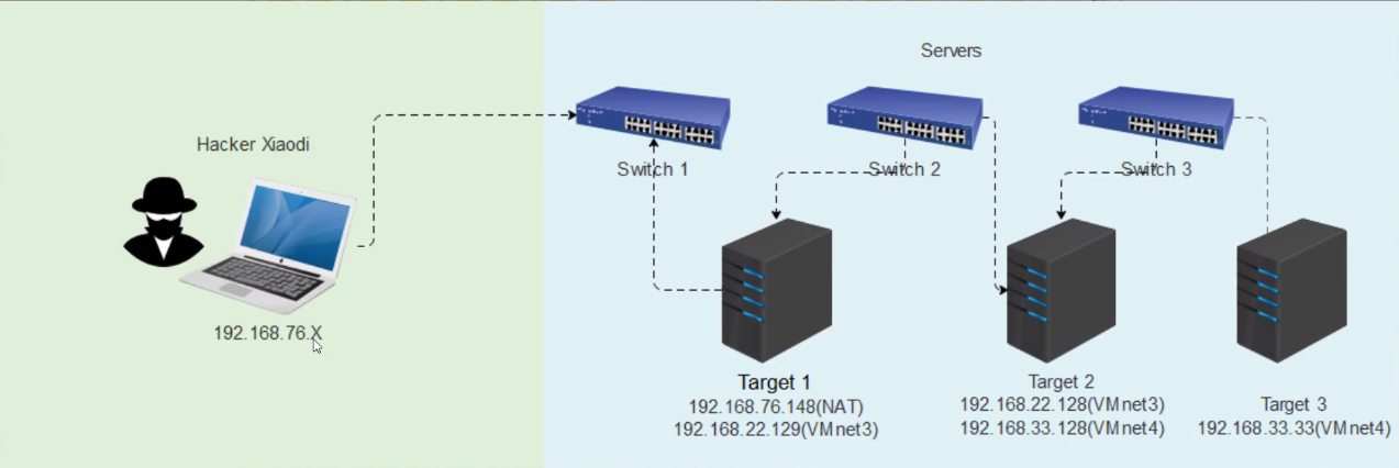 <7>接下来我们开始渗透Target2。kali直接与target2连接是连不上的。因为kali网段是76,target2网段是22,二者不在同一个网段,无法互联,但是target1网段是76和22,target1既跟kali同一网段,又跟target2同一网段,因此,我们可以将target1作为跳板,实现kali和target2的互联。