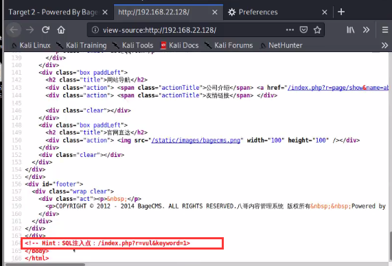 首先探针目标,在源码中直接找到线索,target2上的CMS服务存在SQL注入漏洞。