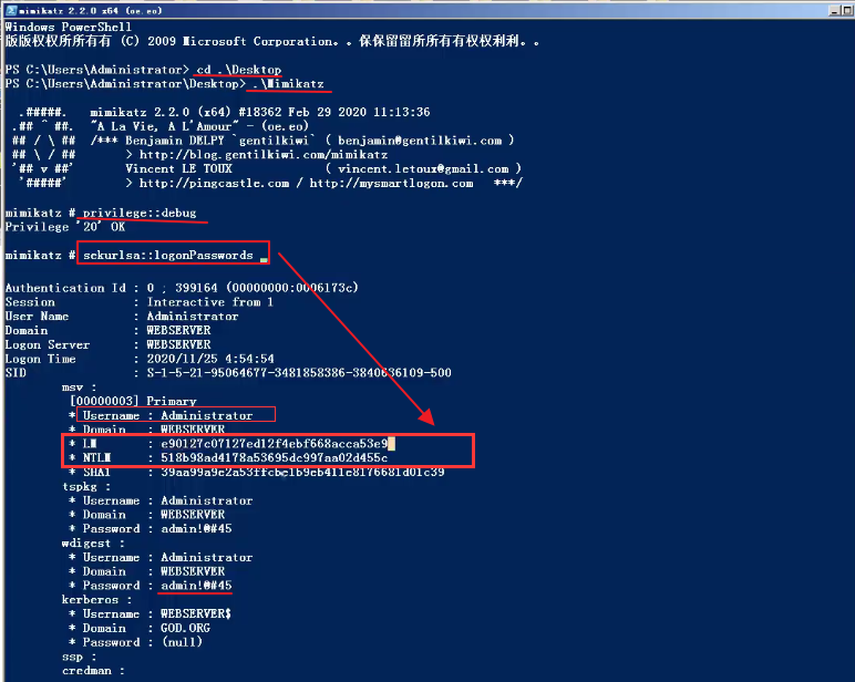 <1>当获取到域内一个主机的权限之后,可以使用mimikatz运行sekurlsa::logonPasswords命令获取其LM和NTLM。