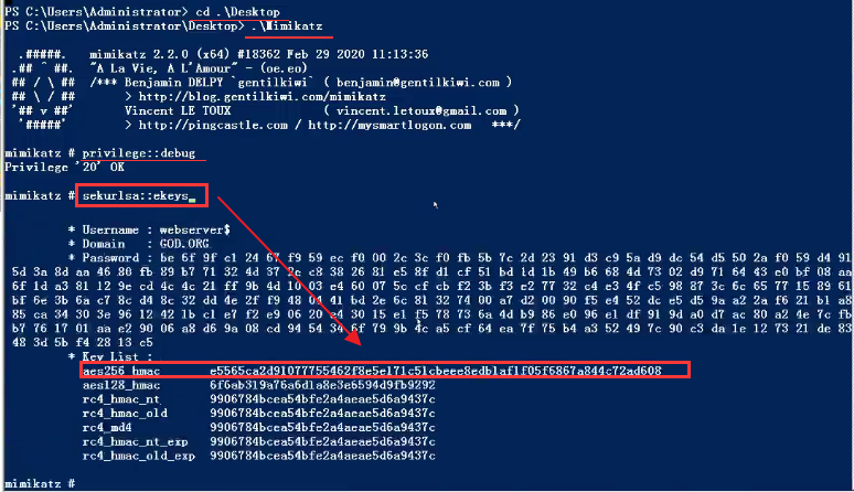 <1>mimikatz运行sekurlsa::ekeys命令获取aes256_hmac。