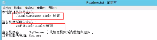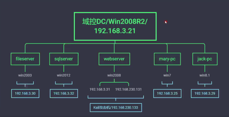 2008 r2 webserver 域内web服务器 本地管理员账号密码: .\administraotr:admin!@#45 当前机器域用户密码: god\webadmin:admin!@#45 2003 x86 fileserver 域内文件服务器 本地管理员账号密码:administrator:admin 当前机器域用户密码: god\fileadmin:Admin12345 2008 r2 x64 dc god.org 主域控机器 域管账号密码: God\administrator:Admin12345 2012 sqlserver 域内数据库服务器 本地管理员账号密码:.\administrator:admin!@#45 当前机器域用户密码:god\dbadmin:admin!@#45 w7 x64 mary-pc 域内个人机 本地管理员账号密码:.\mary:admin 当前机器域用户密码:god\mary:admin!@#45 w8.1 x64 jack-pc 域内个人机 本地管理员账号密码:.\jack:admin 当前机器域用户密码:god\boss:Admin12345