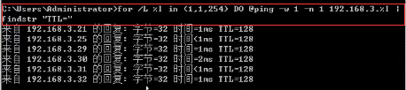 for /L %I in (1,1,254) DO @ping -w 1 -n 1 192.168.3.%I | findstr "TTL =" 自带内部命令(推荐使用)