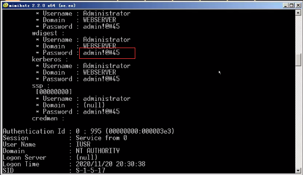 <1>websever登录,运行mimikatz,得到用户名密码。