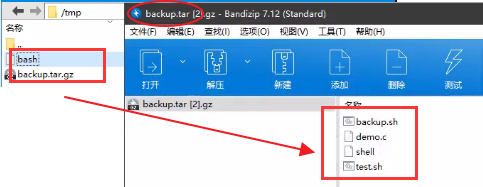 <3>等待一分钟,系统定时任务执行,打包,打开/tmp目录查看,发现test.sh等文件打包为一个backup.tar.gz文件,但我们刚才创建的另外两个文件并未在backup.tar.gz中,而是另外生成了一个bash文件。