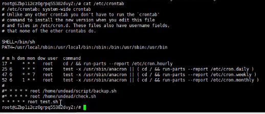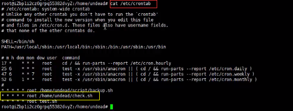 <1>执行cat /etc/crontab命令,查看当前系统的定时任务,发现一个名为check.sh的定时任务,而且是以root权限运行的。