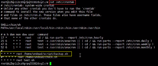 <1>执行cat /etc/crontab命令,查看当前系统的定时任务,发现一个名为backup.sh的备份定时任务,而且是以root权限运行的。