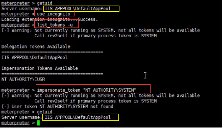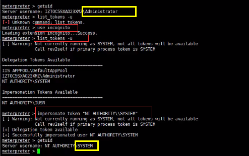use incognito list_tokens -u impersonate_token "NT AUTHORITY\SYSTEM"