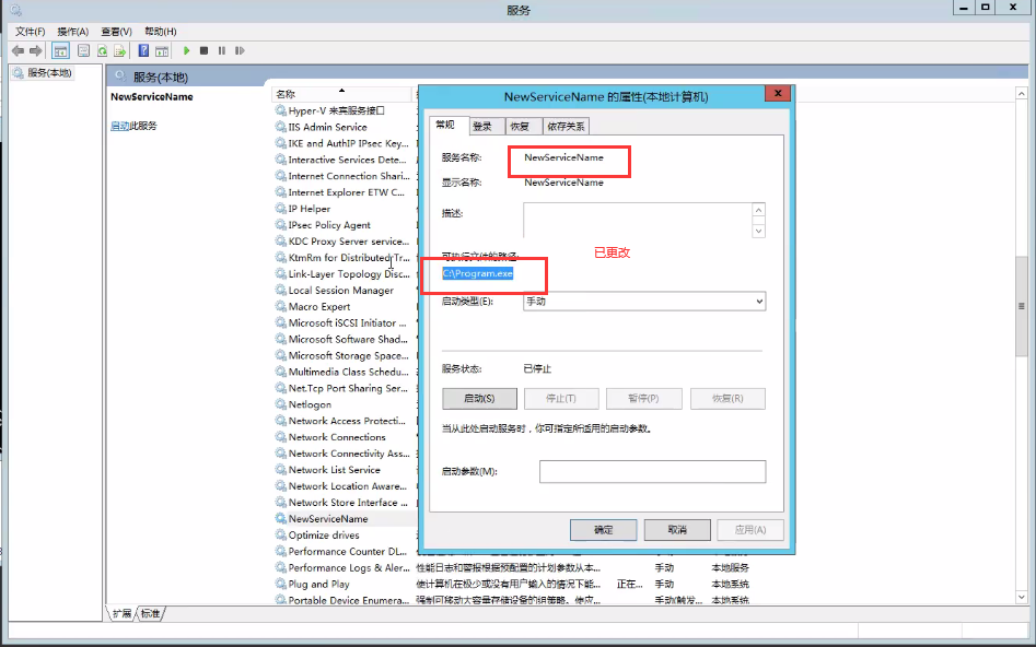 比如选择NewServiceName服务,它原来的服务路径指向为C:\test.exe。