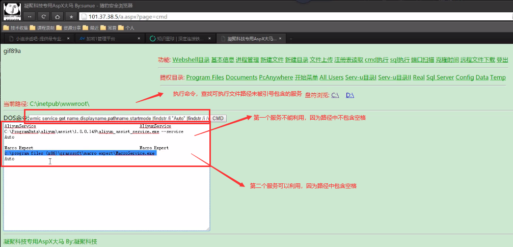 <3>启动服务。可以在webshell中或者本地启动服务。但是测试时,webshell中启动不了,所以不带引号服务路径提权方法还是多用于本地提权。
