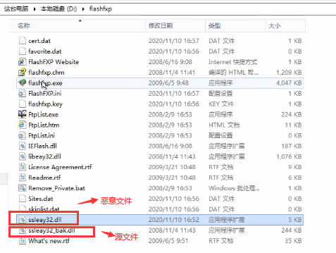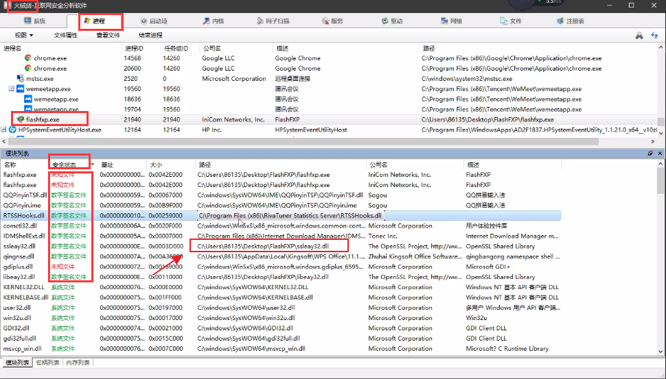 <2>本地下载一个相同的软件,使用火绒剑工具进行进程调试分析。由于系统文件和系统目录里的文件我们无法删除修改,因此我们可以重点查看在软件安装目录里的未知文件和数字签名文件。可以选择ssleay32.dll文件进行后续的删除替换。