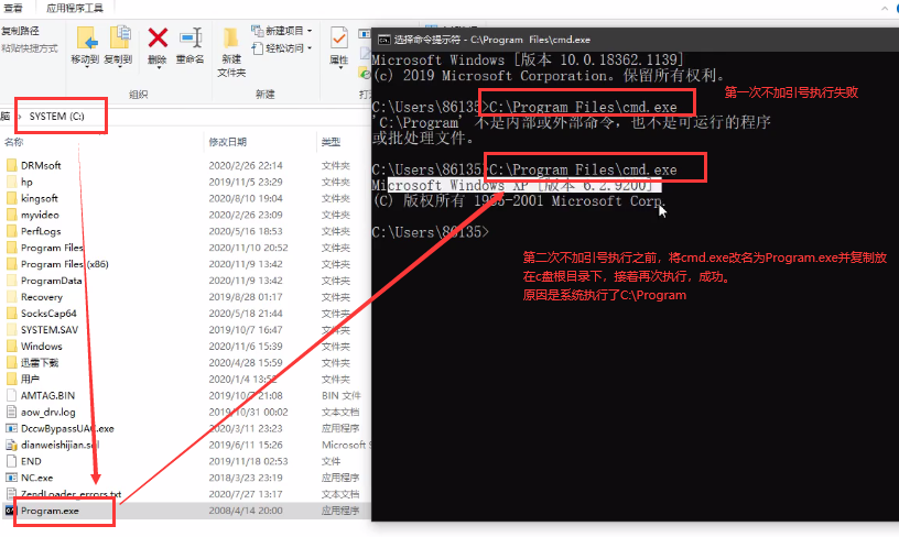 比如,有一个服务a.exe,他的可执行文件的路径是“C:\Program Files\a.exe”,路径被包含在引号中,则系统会正常解释并执行它,但是如果可执行文件的路径是C:\Program Files\a.exe,未被包含在引号中,则操作系统会执行空格之前的C:\Program,而将空格之后的 Files\a.exe当做参数,导致出错,如下图所示