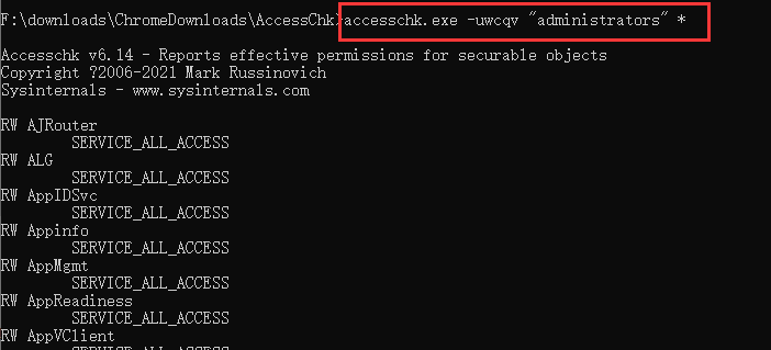 accesschk.exe -uwcqv "administrators" * AccessChk下载:https://docs.microsoft.com/en-us/sysinternals/downloads/accesschk