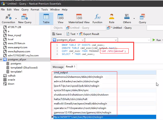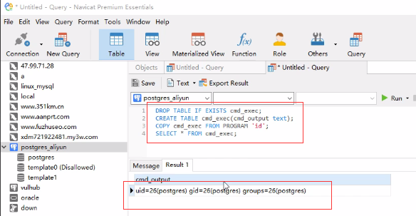 FROM PROGRAM语句将执行命令id并将结果保存在cmd_exec表中。