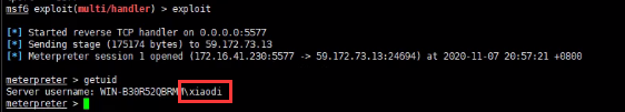 <4>本地监听到会话,查看权限为普通用户xiaodi
