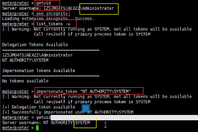 use incognito list_tokens -u impersonate_token "NT AUTHORITY\SYSTEM"