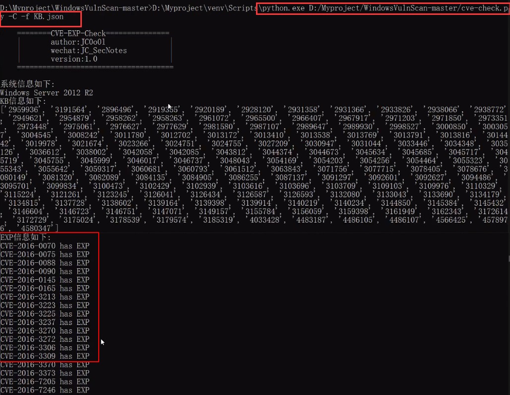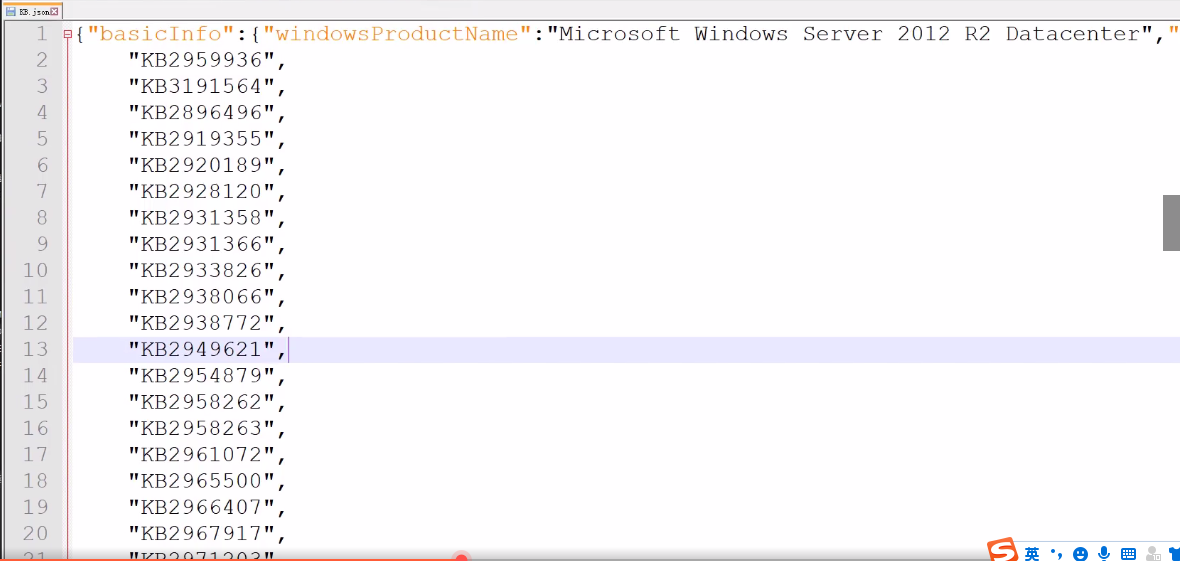 打开KB.json文件,我们看到其实这就是一些补丁信息,我们可以直接用systeminfo命令代替,然后将收集到的信息按照KB.json格式重新排列一下即可。