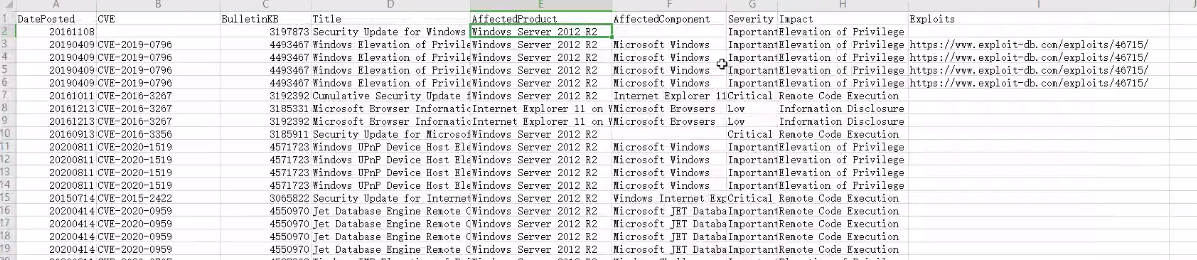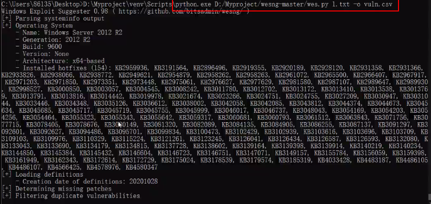 目标服务器执行命令:systeminfo > 1.txt 本机执行命令:python wes.py 1.txt -o vuln.csv