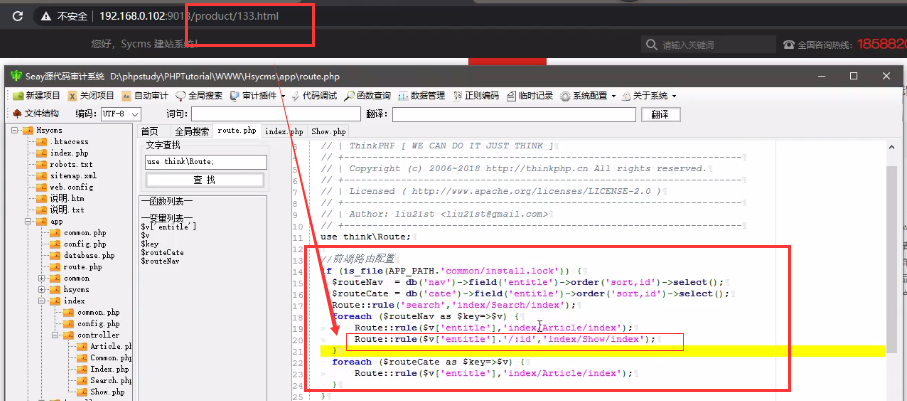 方法1:使用phpstorm或者seay系统打开程序源码,寻找路由,查看路由规则,找到各url访问地址对应的程序文件。比如product/133.html对应的程序文件就是/index/show/index,即app/index/controller/show.php页面中的index()方法。–>优点是可以直接找到对应的方法。