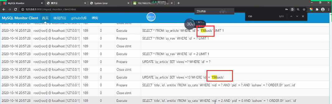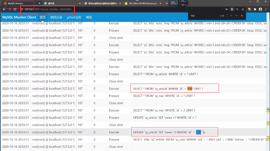 <6>刷新页面时,使用数据库监控软件监控到了执行的SQL语句,正好与源码对应。