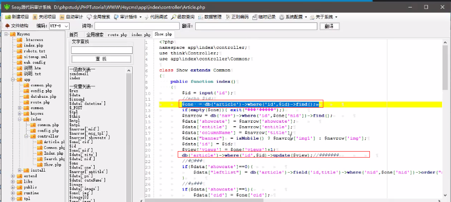 案例2:hsycms-TP框架-不安全写法-未过滤