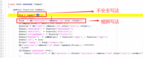 <9>寻找原因。查询源代码,发现虽然SQL语句使用规则写法,但是接收变量id时不规范,使用了自定义的input方法。