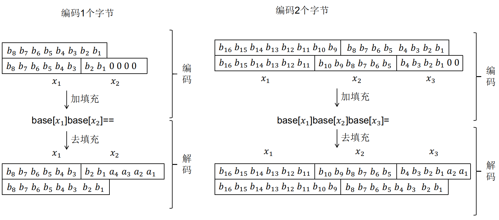 先将附件中每行base64编码进行解码,得到一个Python脚本。但其实信息并非隐藏在解码后的数据中,而是隐藏在编码中。首先介绍base64编码的原理,当需要编码的数据剩下1或2字节时,编码与解码过程如下: