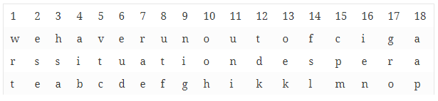 现在,假设我们要对下面这个消息进行加密:We have run out of cigars, situation desperate.