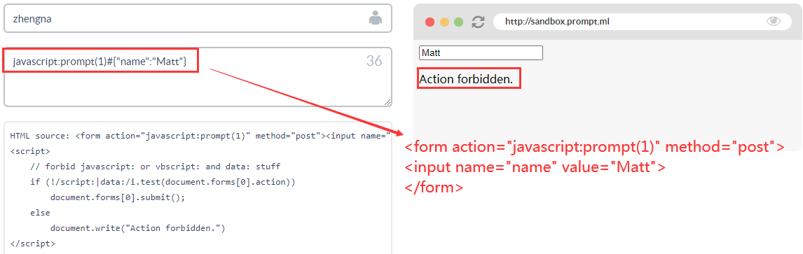 所以我们在构造payload时,可以将input标签的name属性值设置为action,这样document.form[0].action指向的就不是form标签中的action了,因此过滤也就不起作用了。神奇吧。