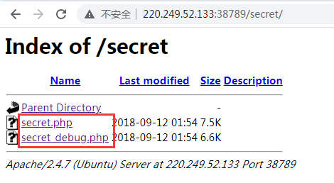 目录扫描可以得到secret目录,该目录文件会被列出来。有两个文件,一个是secret.php一个是secret_debug.php。可以联想到secret_debug是secret文件的调试文件。